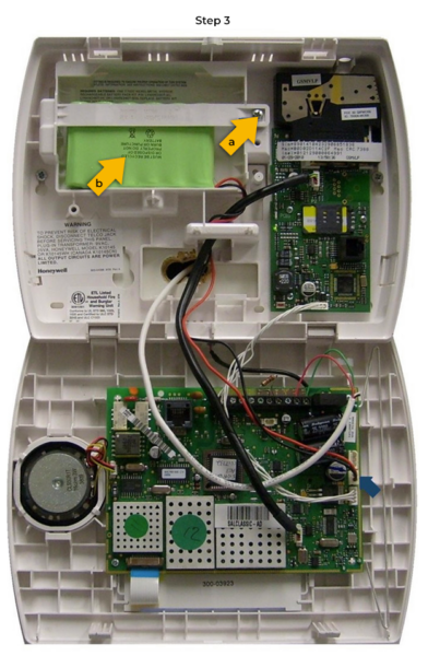 2. Replace with the new Honeywell LYNXRCHKIT-SC 7.2 Volt 1100 mA battery. Secure the red and black connector to the board.